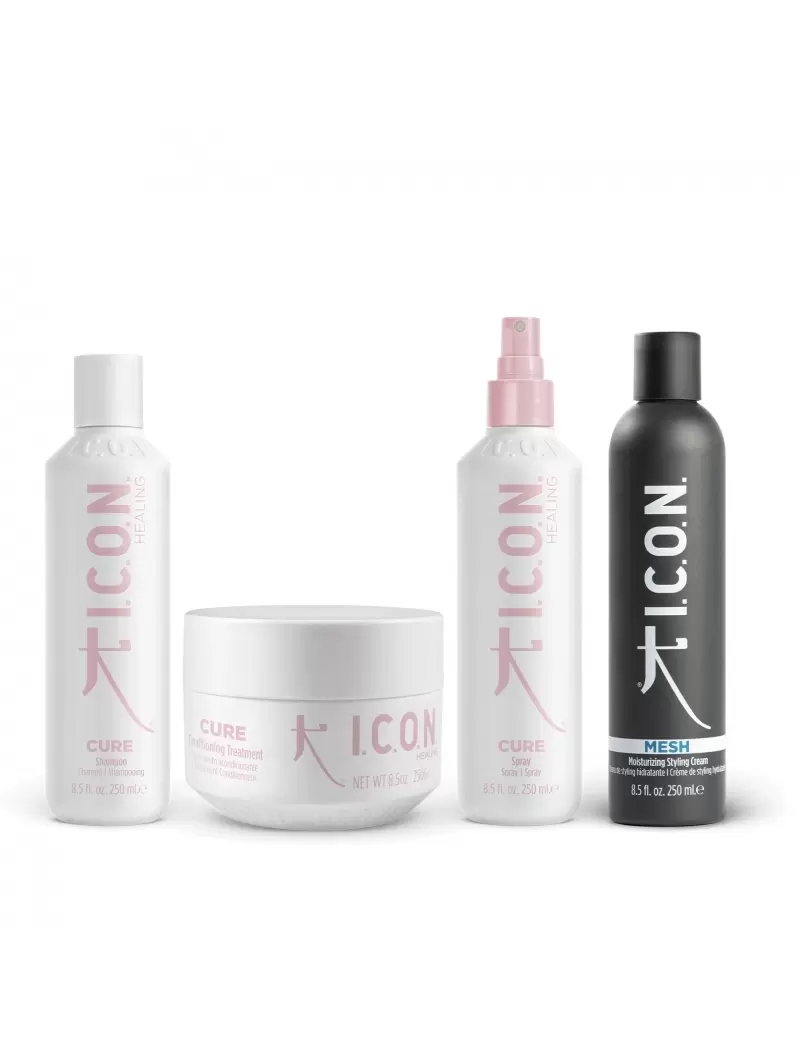 Комплектът ICON Cure с шампоан, балсам и спрей е идеален за съживяване на всеки тип коса, особено права.