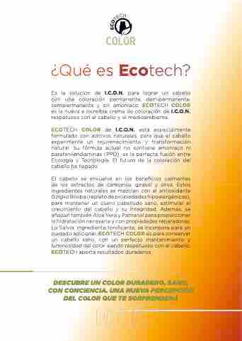 Es la solución de I.C.O.N. para lograr un cabello con una coloración permanente, demipermanente, semipermanente y sin amoníaco. ECOTECH COLOR es la nueva e increíble crema de coloración de I.C.O.N. respetuosa con el cabello y el medioambiente.