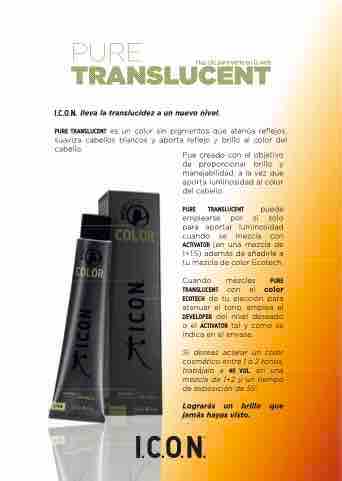 Cuando mezcles PURE TRANSLUCENT con el color ECOTECH de tu elección para atenuar el tono, emplea el DEVELOPER del nivel deseado o el ACTIVATOR tal y como se indica en el envase.