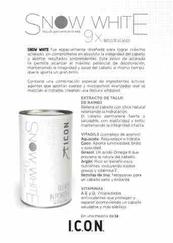 SNOW WHITE fue especialmente diseñada para lograr máximo aclarado, sin comprometer en absoluto la integridad del cabello y aportar resultados sorprendentes. Este polvo de aclarado te permite alcanzar el máximo potencial de decoloración, manteniendo la integridad y salud del cabello al mismo tiempo que le aporta un gran brillo.