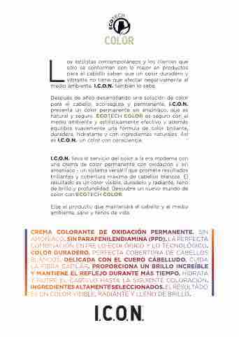 Después de años desarrollando una solución de color para el cabello, eco-segura y permanente, I.C.O.N. presenta un color permanente sin amoníaco, que es natural y seguro. ECOTECH COLOR es seguro con el medio ambiente y estilísticamente efectivo y además equilibra suavemente una fórmula de color brillante, duradera, hidratante y con ingredientes naturales. Así es I.C.O.N., un color con consciencia.